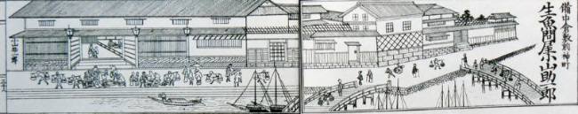 しかしこの屋根替中の倉は、1970年に建て替えられたものである。以前は上の挿絵で示した版本に描かれた商家で、デホルメは激しいが一番右端の建物に当たる。この建物の左の左に画かれている倉は、現在の倉敷考古館である。両者の間の建物は、現在は建て替わって考古館の一部となっている。