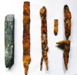1958年、まさに今から半世紀前、その未盗掘古墳を調査したのは倉敷考古館の私達だった。総社市の簡易水道貯水タンク一つの設置場所として、山が削られて発見されたのが随庵古墳だった。公の調査機関のない時代、県内各地からこうした緊急な相談が持ち込まれ、何の予算もないまま、有無をいう間もない調査に追い立てられていたと言うのが、当時の実態だった。 勝負砂古墳とたいへんよく似た随庵古墳の竪穴石室には、割竹形の木棺も一部残り、甲冑・武器類・馬具のほかに、写真に示した鍛冶屋道具一式、農具類、その上美しい紫水晶の勾玉二個を含む玉類など、豊富な副葬品が存在した。鍛冶屋道具は全国的に見ても、セットが揃って出土した例は30例有る無しである。古墳の多さを思えば、当時鍛冶屋具がいかに珍しい最先端技術の器具であったかが窺える。吉備の国ではこの随庵古墳を含めて4古墳でセットが出土している。吉備と鉄との強い関係を示す重要な遺物と言える。
