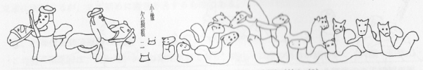 磯上出土のものは、古くから東京国立博物館の所蔵である。一個の台付壷形土器の肩に、乗馬姿の二体の人物の他は、個体分離も出来にくいほどの、動物・人物の入り組んだ小像が16~17体も付く。下手なスケッチで分かりにくいかもしれないが、まだ写真より状況はわかりよいと思う。