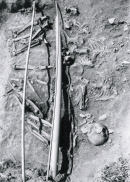 上部の1体は、位置が浅かったことと、堀割った溝と平行に埋葬されていたので、破壊が激しく、詳細は不明であった。下部の4体の方も、写真で分かるように、中央部の破壊が激しいだけでなく、幅狭い農道と丁度直行した埋葬位置だったので、農道の側溝で、3体は頭骨がほとんど削り取られた、哀れな姿であった。