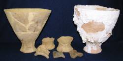 この土器の説明には・・・倉敷市児島味野の仁伍遺跡出土、弥生時代中期の脚付製塩土器(写真左)をモデルに作成した土器で、製塩実験を行ったもの、ただ一度の実験でこのような状態になった・・・程度のことしか述べてない。