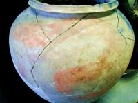 この遺跡に次々埋葬された30人ばかりの人々の中でも、主だった人の葬送の際だろうか、それとも合同での祭りの時だろうか、ともかく供え物の土器に穴を開けたときに、この土器には真っ赤な顔料が注がれたのだろう。このなかに入っていたものが何であったのか?・・・・全ての土器に注がれては無いので、そこには特別の意味があったに違いないが、いまではわからない。何かの血潮の代わりなのか、それとも赤の顔料自体に、特別の威力を認めていたのか・・・・