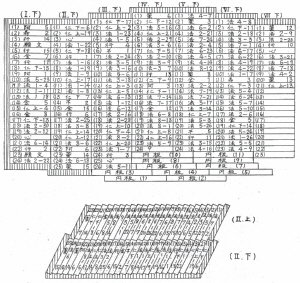 粘土塊から取り出した瓦経には、7列2段並びのどの位置であったかの記号を付けている。経典検討で、やっと分かってきた法華経の存在だったが、この瓦経では200枚余にわたる枚数になる法華経は、出土位置と照合すると、まるでトランプのカードでもきったように、全くばらばらに埋納されていたのだった。ただ文字の向きだけは、法華経に限らず、全ての経典が上向きだった、というだけであった。埋納時に経を本来の形にする意思はなかったのだ。