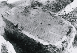 発掘時、遺跡で上面から瓦経配列状況の確認、瓦経境を白線で区画している