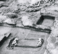 女男岩遺跡 中央埋葬と、家形土器出土の溝中石列など