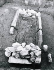 中央埋葬 木棺の周辺は粘土で巻かれ、棺の小口には石積み。中に見えるのは埋葬者の足の骨