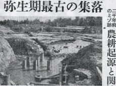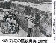 左二枚の写真は新聞写真だが、共に弥生時代の最も古い水田跡で、杭や矢板痕が確認された周辺調査風景。 右端の神戸新聞には「事件」の文字も見える。
