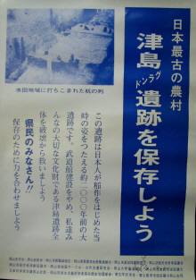 展示室内には、簡単ではあっても、遺跡のことが分かりよくまとめられた、無料のパンフレットが幾種かある。その中の一つに、この津島遺跡の「発掘調査の歴史」として順次発掘原因と年次が並べられているが、上に示したような事情には、まったく触れてない年表。その時代を生きた者として、これに解説を加える義務があるだろう。僅かな説明だけでも事態は分かってもらえると思う。