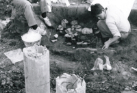 考古館に保存中の写真。同年6月の、津島遺跡県職員調査風景、周辺にはパイルが打ち込まれている。出土土器は弥生時代前期