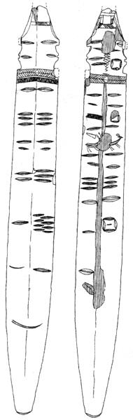 この木製品には見て分かるように、多くの線状横刻み目と方形の刻み模様に、雄鹿が2頭、刃と柄の境目には、綾杉文と複合鋸歯文を彫り込んでいる。表裏で模様は異なる。同じような横線刻みにも、わざわざ長さが半分の刻みを配している部分がある。こうした配列が、決して無意味とは思えない。この意味は一体何だろう?
