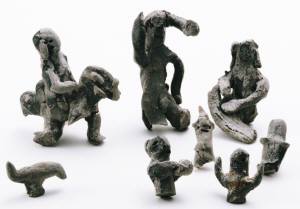 ところでここに見るような像は、大きくてもせいぜい10cm少々、多くはそれ以下の小さい姿がほとんどである。一見、決して美しいとか造詣がすぐれているとは言えまい。そのため四半世紀も以前には、こうした小像を付けた須恵器は、大変珍しい貴重品とされてはいても、個々の小像たちは、ただ風俗を映すものという程度の理解だったのだ。